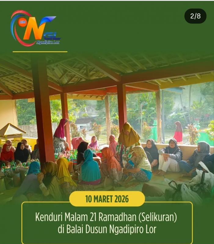 Pada hari Selasa, 10 Maret 2026, warga Dusun Ngadipiro Lor melaksanakan kenduri malam 21 Ramadhan (selikuran) yang bertempat di Balai Dusun. Kegiatan ini merupakan tradisi masyarakat untuk menyambut datangnya malam-malam terakhir di bulan suci Ramadhan yang penuh keberkahan.
